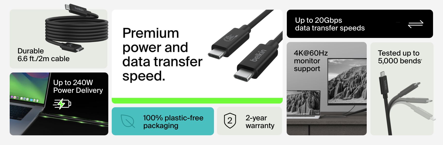 Καλώδιο USB4 για φόρτιση συσκευών υψηλής ισχύος στα 240W και μεταφορά δεδομένων με ταχύτητες της τάξης των 20Gbps. Παιχνίδι και ροή με εκπληκτική ευκρίνεια στα 4K 60Hz. Το καλώδιο USB4 έχει μήκος 6,6ft/2m, φέρει πιστοποίηση USB-IF και περιβάλλεται από ανθεκτικό, πυρίμαχο υλικό.