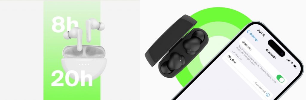 - Η μεγάλη διάρκεια μπαταρίας εξασφαλίζει τουλάχιστον 8 ώρες αδιάκοπης αναπαραγωγής, συν 20 ώρες αυτονομίας μπαταρίας με τη θήκη φόρτισης